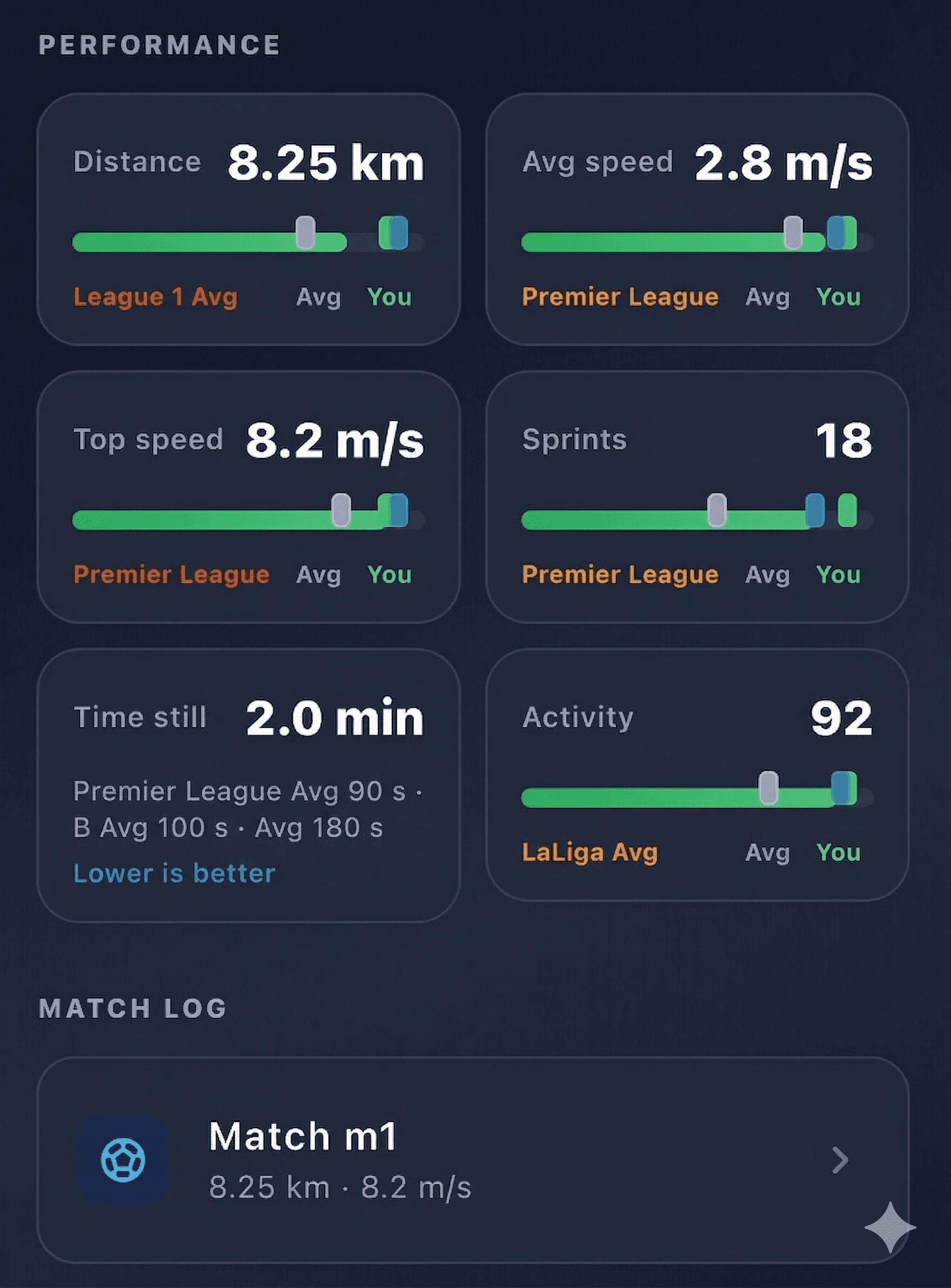 Every action you take on the pitch, from passes to sprints, is captured and analyzed instantly by our football uniform, no interruptions, just pure insight.